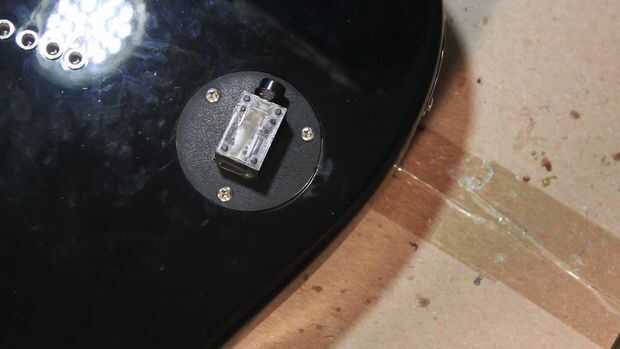 Nosotros dos pedazos de alambres sueltos a los pines de soldadura y corte un agujero en la placa trasera, para que el jack mono puede sentarse en la parte superior, con su panel conexiones expuestas a través del orificio.