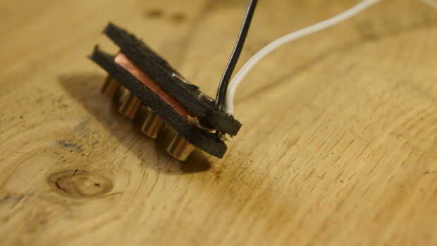 Una vez que una bobina envuelta, haga dos orificios en la placa inferior para cables. Estos cables deben soldarse a los dos extremos de la bobina que dejaste colgando cuando envuelve la bobina. Recomiendo pegar los cables a la placa base para evitar que los cables tirando del sustentador. También decidió deslizar un trozo de tubo sobre los cables para añadir alguna ayuda y la protección del abrigo del encogimiento.