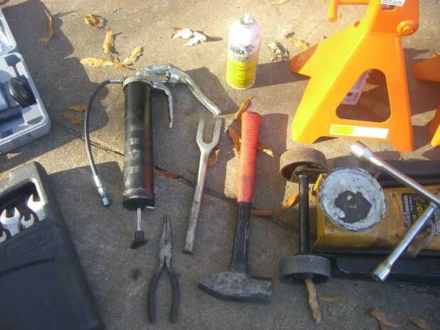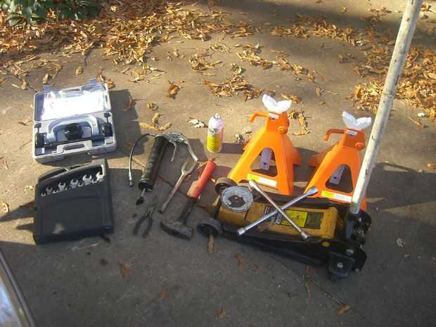 Las herramientas que se muestra a continuación son todo lo que usted debe necesita... Si no tenga ningún problema. Inevitablemente, se ejecuta en un problema, o que te gustaría utilizar otras herramientas para hacer el trabajo más rápido. Además de lo que ves aquí, también tuve que usar una barra de interruptor automático de 24", un soplete de propano (bueno para las tuercas) y un trinquete para acelerar las cosas a lo largo.