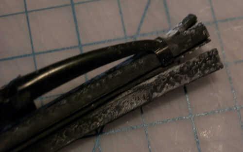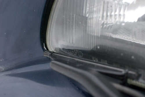 Para retirar las cuchillas del limpiaparabrisas de un V70, oscilación hacia fuera de la escobilla, sujete el brazo del limpialunas y tire hacia atrás de la hoja (desde la perspectiva de mirar la punta limpia de la lámina de limpiador).