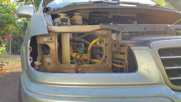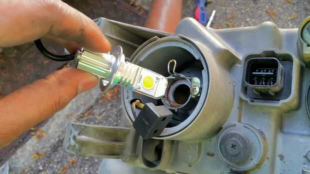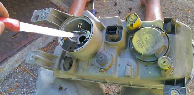 La Asamblea de Faro lado derecho tuvo que ser quitado así que puedo raspar el agujero más ancho con un cuchillo. Sí sé que es primitiva. Después de 5 minutos terminé y forma el led. Volver a instalar a la Asamblea del faro y me aseguró el conductor llevado y el cableado.