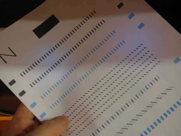 Hay transporte plástico cubiertas y etiquetas que deben eliminarse antes de instalar los cartuchos. Luego instale los cartuchos nuevos e imprimir una página de prueba. La impresora se dice que tiene poca tinta. Pero usted sabe mejor. Puesto que usted está usando el chip viejo, la impresora no sabe que es un carro nuevo. Examinar la página de prueba para asegurarse de que todo parece OK. Si es necesario, realizar una alineación de cartuchos.