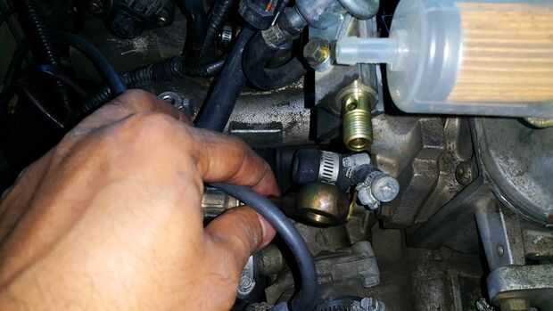 El perno banjo en el riel de combustible tuvo que ser quitado usando un cubo de 17mm. Ahora, no haya presión residual en el riel de combustible. Hay 2 arandelas que deben colocarse durante la instalación.