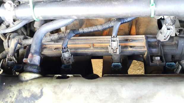 No hay necesidad para quitar las líneas de combustible. El riel completo con inyectores se puede levantar fácilmente hacia fuera para el acceso a los inyectores. Cada inyector tiene un clip de metal que puede apalancar hacia fuera una vez retirado el tren entero.