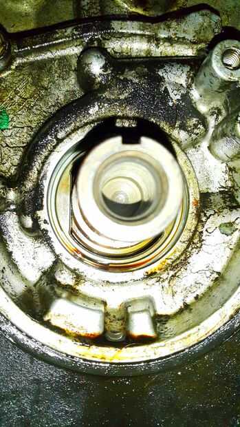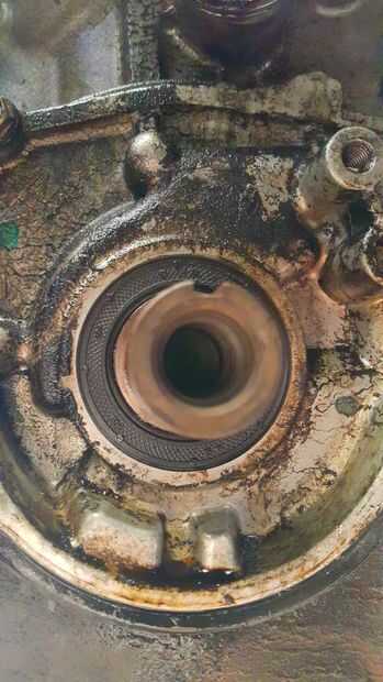 Utilizando un destornillador plano pequeño en el cigüeñal apalancar con cuidado el sello hacia fuera. Salió muy fácilmente. Es hiper importante no a arañar la superficie del cigüeñal. Hay evidencia de filtración de aceite en el sello bien.
