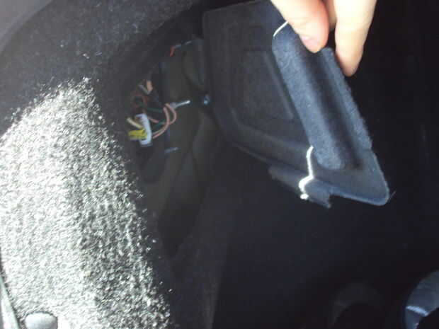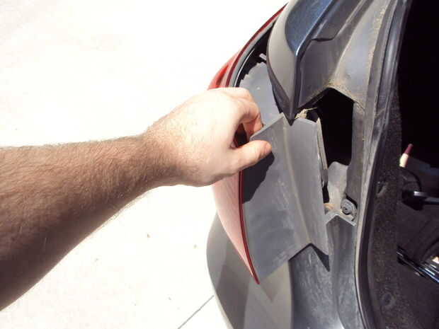La luz trasera puede sustituirse sin quitar la Asamblea. Opté por quitar la Asamblea porque es muy sencillo y permite un acceso más fácil a la bombilla. En primer lugar, abrir su cajuela y levante la puerta de plástico que proporciona acceso a la la Asamblea de luz de cola.