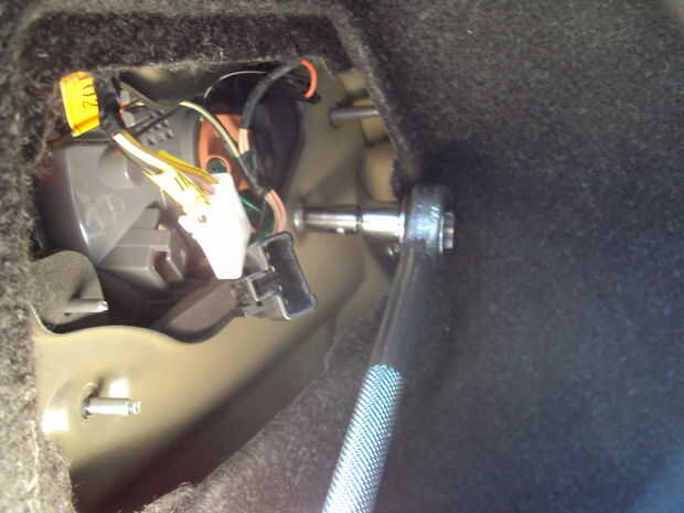 Ahora usted necesita utilizar una llave de 8mm para quitar las 3 tuercas que sujetan el conjunto al chasis. Tenga cuidado de no dejar caer las tuercas en la cavidad hueco del parachoques trasero.