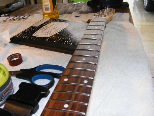 ¡ Un momento! ¿Recuerdas paso 3? Leer eso. ¿De aceite el diapasón? ¿Limpiar? ¿Pulir los trastes? Usted está haciendo todo este trabajo, por lo que también puede hacer más mientras estás en él.