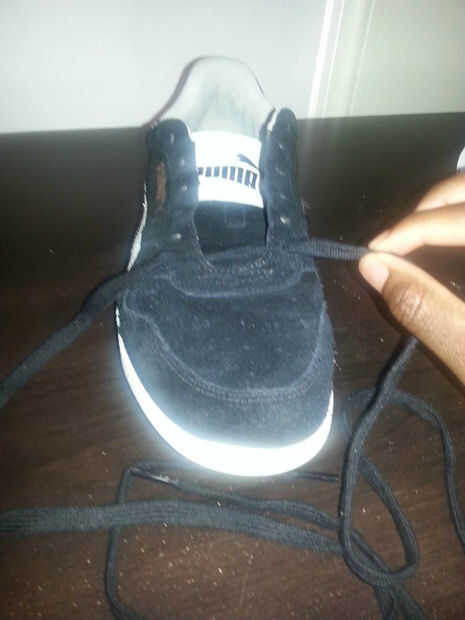 Después de sacar la zapatilla vieja Inserte el cordón nuevo a través de los agujeros de encaje dos la parte inferior de la zapata. Introducir desde el exterior de un agujero por el interior del otro.