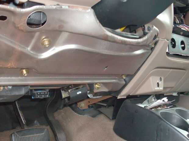 Espinillera metálica cubre dos de los pernos que sujetan la cubierta de plástico que rodea el racimo del instrumento. O bien puede quitar la espinillera en conjunto o si eres vago como yo puede quitar sólo los dos 5/16 pernos frontales y afloje los otros tres. Estos son los únicos que utilizan el socket de 5/16".