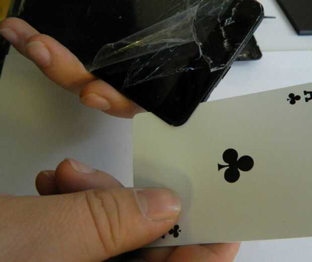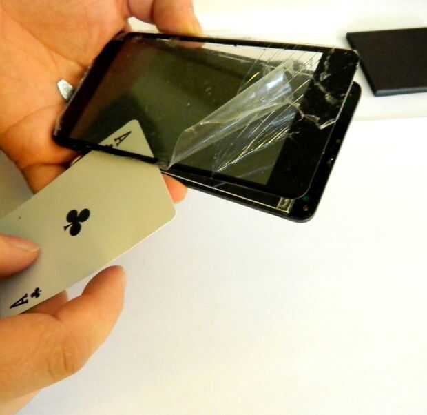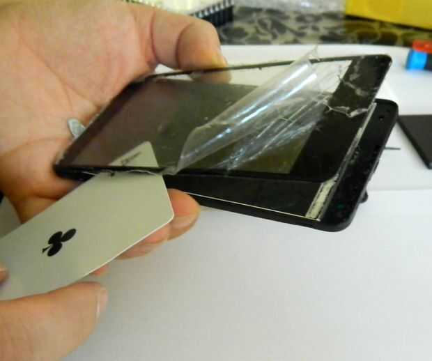Para quitar la cinta y separar el cristal del teléfono se puede hacer con naipes de plástico. Sí, usted me oyó bien. La carta es lo suficientemente delgada para caber entre el teléfono y el vidrio y su disco duro suficiente para cortar la cinta allí. Comenzar insertando la tarjeta en la esquina inferior del teléfono y empezar a empujarlo dentro.