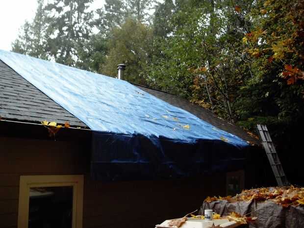 Empecé con la venerable lona azul en el techo de mi garaje. Donde vivo en el estado de Washington, empezó a llover la semana pasada. Puede dejar el próximo mes de julio.