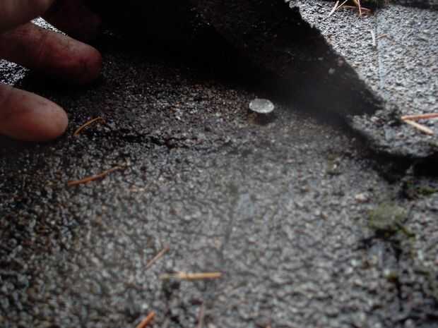 La segunda foto muestra la cabeza de un clavo que sobresale aproximadamente 1/4" después de había martillado desde abajo. De lo contrario hubiera tenido que cavar en la teja para meterse en la cabeza del clavo.
