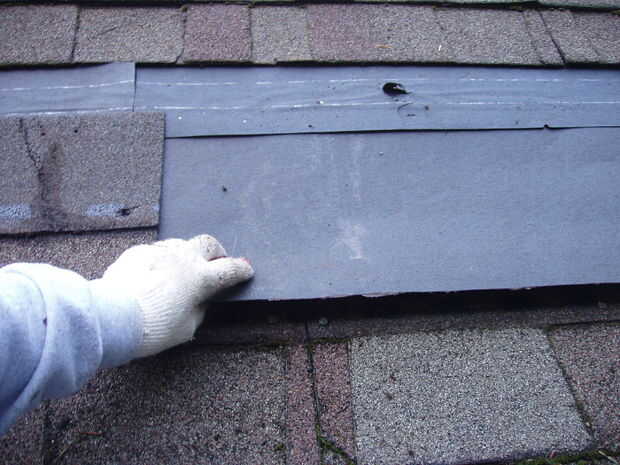 Esta foto me muestra desplazamiento nuevo alquitranado # 30 bajo el alquitranado existente. Desea instalar nuevo alquitranado en la medida hasta el techo como sea posible, en el área donde se colocarán las tejas nuevas. Lo # 30 es lo suficientemente rígido para hacer esto, # 15 no funcionen.