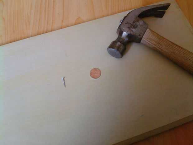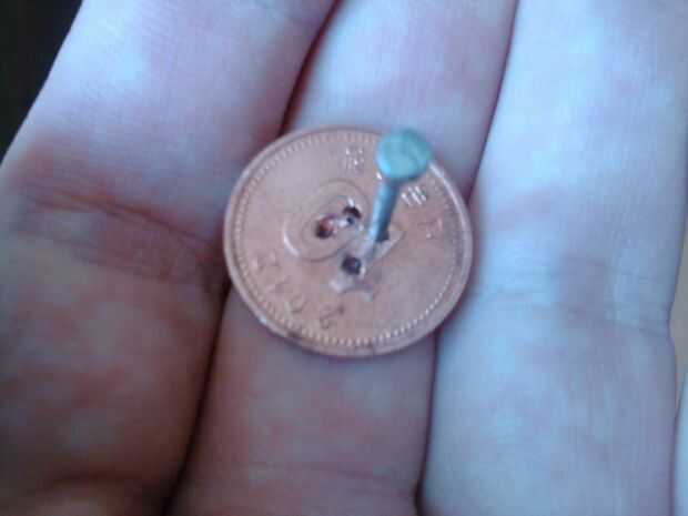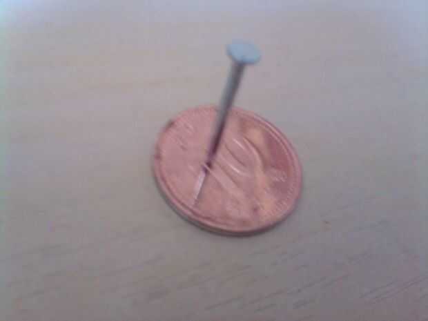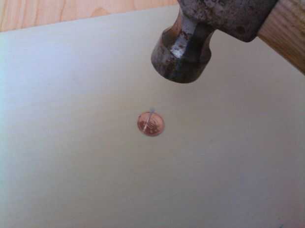 Ahora lo que tienes que hacer es sacar la madera y coloca la moneda encima de ella. Ahora, sacar el martillo y clavo. Con cuidado coloque la uña sobre la moneda, sólo un poco fuera del centro. Cuando usted siente que su ubicación es buena, le dan un buen golpe duro con el martillo (dado en el clavo, evitar golpear los dedos, hacer eso duele). Si todo ha ido bien, la uña se asomó un agujero a través al otro lado de la moneda. El lado que es afrontar ahora probablemente será el lado que mira hacia fuera, a menos que quieras afilada hacia el exterior.