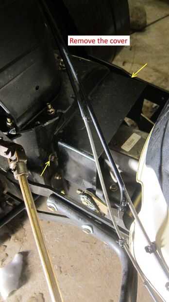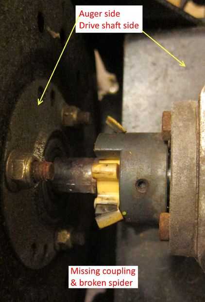 Una vez retirado el soplador de nieve del tractor levantó esto con las hojas de barrena hacia abajo a la tierra. Entonces pude sacar la tapa quitando la tuerca de 1/2" y perno de cada lado. Ahora pude ver la falta de acoplamiento une el eje a eje de la barrena y la araña de plástico rota.