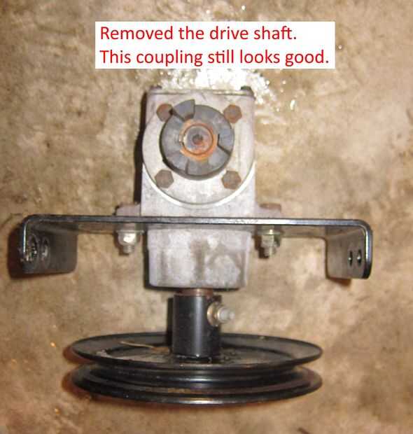 A continuación Quite los cuatro pernos de 9/16" en el eje. También quité el pequeño bar que mantiene la correa de transmisión en su lugar. No tendrá que eliminar esto pero que hace más fácil trabajar con la correa fuera del camino. En mi caso el acoplamiento en el eje lateral todavía se veía bien, pero asegúrese de que usted Inspeccione esto y cambie si cualquier duda.