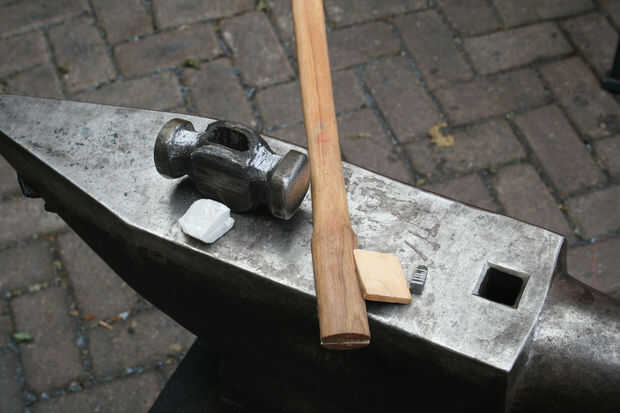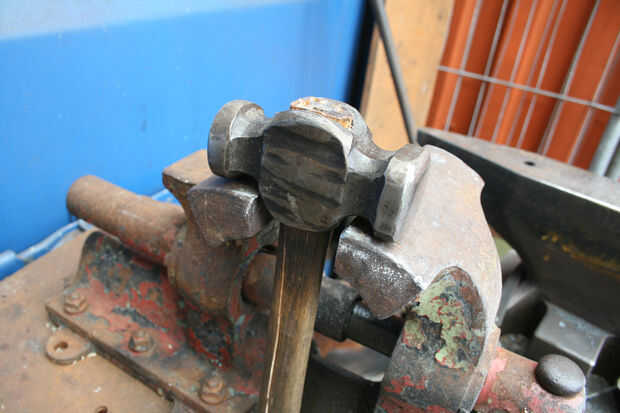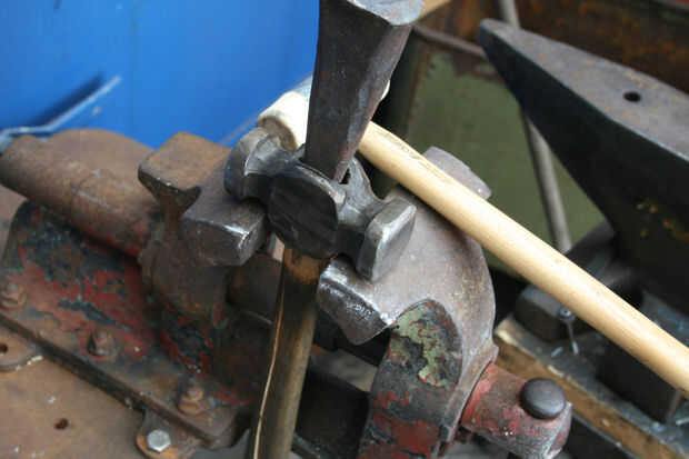 Colocar el martillo en la prensa como en la primera foto. Esto da la vieja separación de mango por lo que fácilmente puede ser eliminado.