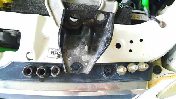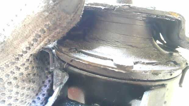 Quitar los tornillos 14mm (3) y (3) tuercas de 17mm, sacó el Monte falso. Puede ver las grietas en el amortiguador de goma.