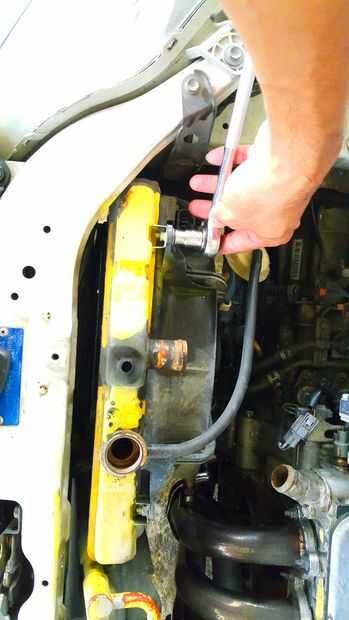 La manguera superior del radiador debe ser desconectada en el radiador o eliminarse completamente. La conexión eléctrica tiene que sacarse y los dos tornillos de 10mm en la parte superior del ventilador eliminarse.