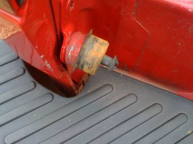 El paso de abetos es quitar la puerta vieja. Esto es bastante fácil, quite los tornillos de torx de cada lado de la puerta trasera. Este tornillo es el que sostiene el cable de retención. Asegúrese de que tener la puerta apuntalada antes de retirar estos completamente.