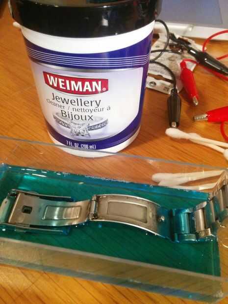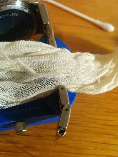 Me ahogó la pulsera de la joyería más limpia durante 5 minutos y enjuagar en agua limpia. Después de que tomé paño de queso,, doble lo capas y pasa a través de cada eslabón de la pulsera para conseguir entre esos puntos.