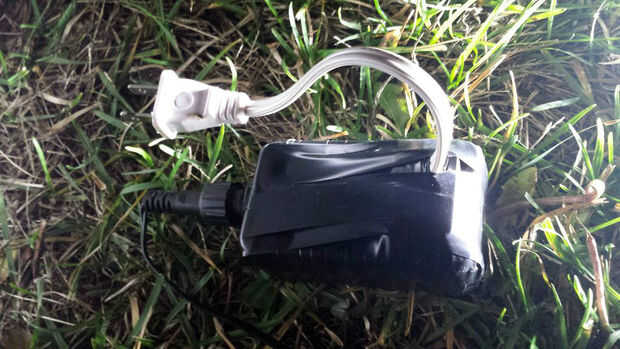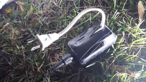 El cable blanco asomando fuera de la cinta aislante fue un trabajo de corte rápido que hice el año pasado para hacer este trabajo. Después de que fuertes vientos soplaron los muñecos de nieve por la calle la primera noche que teníamos, tuve que reparar los dientes que faltan en el adaptador. Puedan abrir la caja de plástico del adaptador por lo que pude ver lo que podía hacer. Corté un cable de un ventilador roto fue tirar y soldar los cables a los cables sueltos en el adaptador de CA. Fix trabajó para todos de la temporada de Navidad del año pasado y la mayor parte de éste.