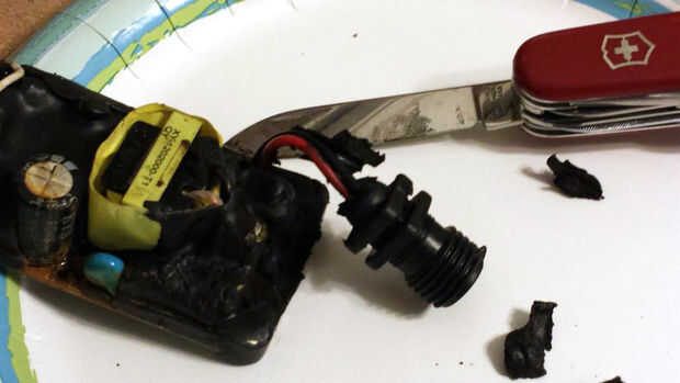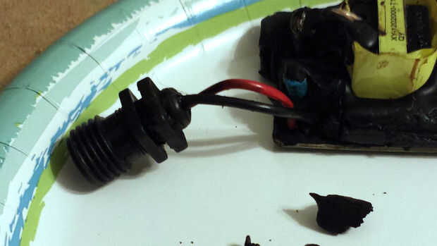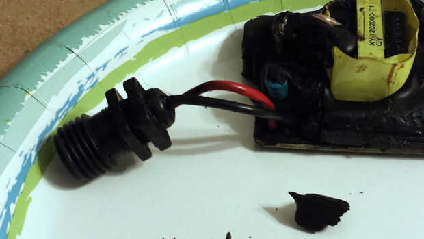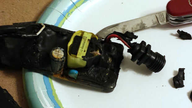 Dentro de la alimentación, todo el espacio vacío fue llenado con algún sellador negro. El sellador fue en algún lugar entre una cera, silicona y pegamento caliente, y hecho un desorden en mis manos y el cuchillo que estaba usando para quitarlo.