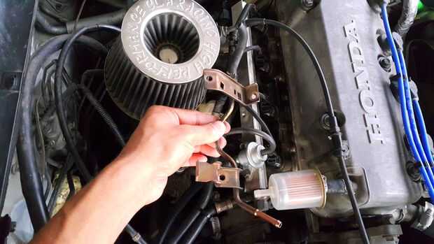 La línea dura se llevó a cabo por dos pernos de 10mm. Eliminación de los y las conexiones de manguera en el regulador de presión de combustible y la línea de retorno de combustible, estos pongo a un lado.