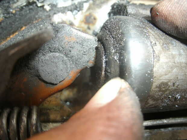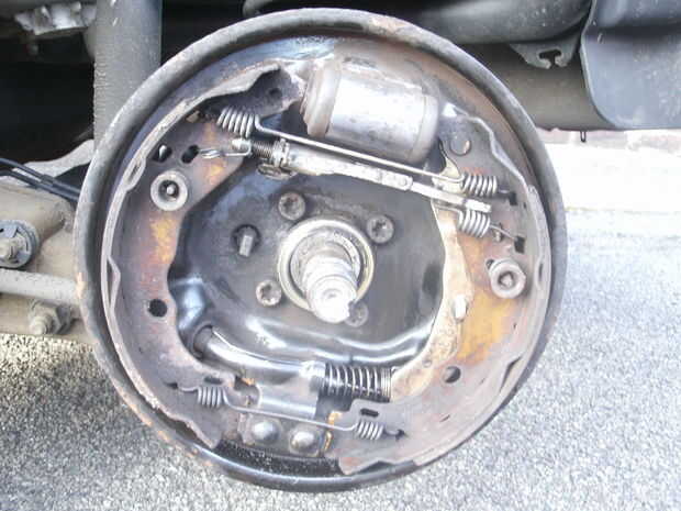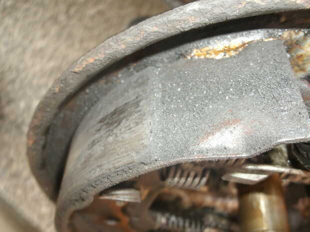 Con el tambor se puede quitar los zapatos, también es digno de la comprobación de signos de fugas de cilindro de freno. No pude saber en el momento pero mi fotos son algo borrosas, el primero muestra un seco montaje de calzado polvoriento no escaparse, el segundo un cilindro agujereado gomoso. Como freno líquido tiras pintura estaba claro que tenía un lado fuga, probablemente por un tiempo.