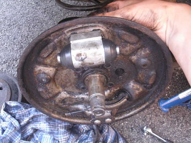 El cilindro es celebrado con una sola tuerca (10mm). La foto es de la parte posterior de la placa de freno, un ángulo no puede conseguir su cabeza en fácilmente a menos que tenga un elevador adecuado. Tiene un montón de trapos absorbentes para atrapar el líquido de frenos. Utilice una llave de tubo de freno para anular el tubo y el cilindro se mueva hacia fuera. Poner en una nueva, conecte el tubo de freno y vuelva a colocar el tornillo. Los zapatos y el tambor tienen que estar en antes de purgar el sistema. Usted tendrá que aplastar los pistones en y no quería forzar aire en el sistema por lo que aflojar la tuerca de la purga mientras lo hice.