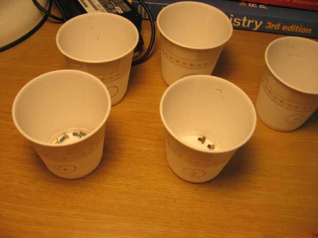 Quitar el disco duro, unidad óptica, batería, y lo que nunca se puede quitar. Quite los tornillos y asignar número de tornillo. Coloque los tornillos en vaso desechable correspondiente. Tenga en cuenta donde y qué tipo de tornillos estaban allí.