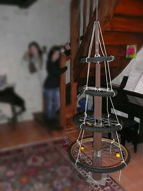 Este año me estaba preguntando qué podíamos hacer y cuando entré en mi garage me di cuenta que tenía bicicletas de diferentes tamaños. Me quité las ruedas delanteras de cuatro motos y limpiado. También encontró varias piezas de tubos de cartón y había añadido alguna cadena.