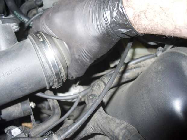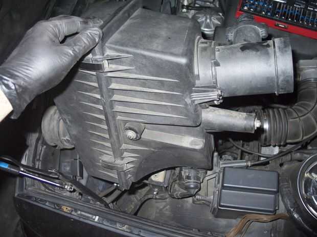 Una vez que se verifica que, nada más es la celebración de la caja del filtro, empezar levantando mientras tira suavemente el fuelle de admisión goma. Se puede hacer presionando un lado de la bota. Si todo lo hace bien, la caja del filtro debe salir sin complicaciones.