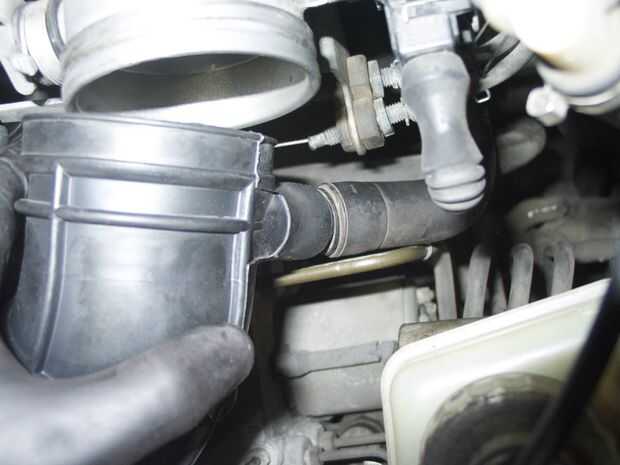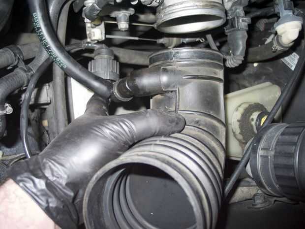 Con filtro de aire hacia fuera de la vivienda, compartimiento del motor debería tener este aspecto. Es hora de soltar el otro extremo de la bota, quitar par de mangueras conectadas y deshacerse de él. Afloje la abrazadera grande colocar la bota al acelerador control vivienda y luego suavemente tire de ella. Hay dos mangueras en la parte inferior de la misma, así que ten cuidado. Saque los conectores de la manguera y eliminar por completo el viejo rasgado parte. Compruebe hacia fuera las grietas en una de las fotos.
