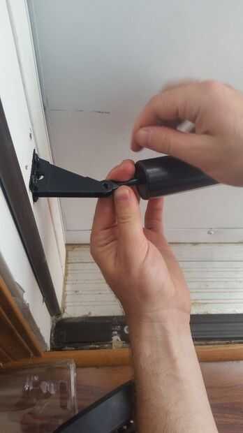 Deslice el resorte en su lugar al soporte de puerta primero. Alinee los orificios y colocar el pasador de fijación.