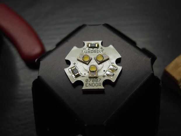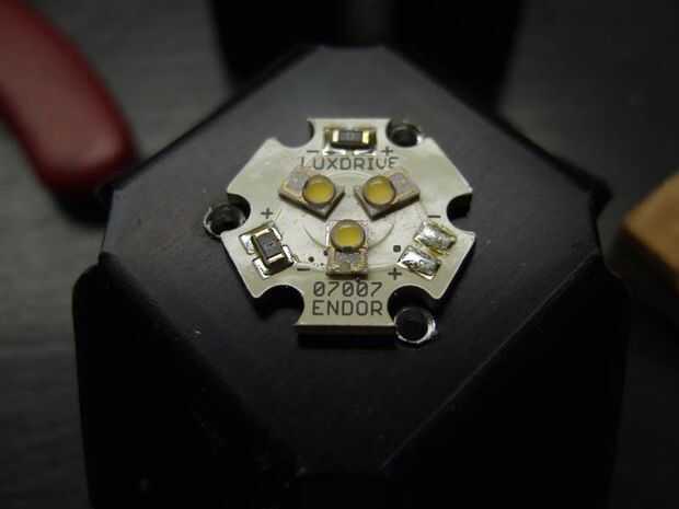 El primer paso es perforar tres agujeros en el disipador de calor que coinciden con tres de las seis ranuras de la Junta de estrellas LED. El tablero estrella se hace un sandwich térmica especial que permite el traslado fuera de la matriz de LED y en el tablero y luego el disipador de calor de calor con resistencia mínima (y por tanto delta T). La parte de atrás de la estrella es metal pero no eléctricamente conectados a los LEDs y debe hacer macizo contacto térmico con el disipador de calor. Así que toma tu estrella y coloca en el disipador de calor y su ubicación la globo ocular y luego realizar tres marcas en las muescas alrededor de la estrella para marcar donde taladra los agujeros. Luego quitar la estrella y perfore los agujeros y tóquelo para que se enrosque los tornillos directamente en el disipador de calor. Si no tienes las herramientas o medios para aprovechar los agujeros, perforar sólo les lo suficientemente grande como para que los tornillos a través del disipador de calor y utilice tuercas en la parte posterior para sostener la estrella hacia abajo. Ver las fotos de esclarecimiento.