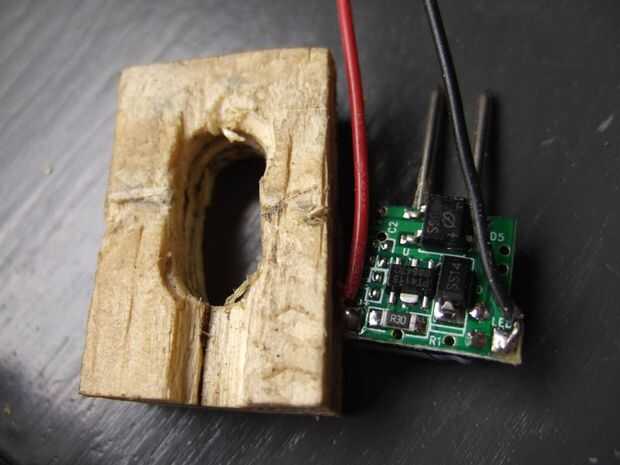 La clave para conseguir esta "bombilla" en la lámpara de halógeno es compacto montar el controlador en el disipador de calor. Esto se logra cortando un trozo de madera que encaja entre las piernas del disipador de calor y que cuenta con un centro perforado hacia fuera donde podemos caliente pegamento el circuito en coche con seguridad. También pueden perforar los agujeros en las piernas de disipador de calor añadir tornillos si no confías en el pegamento caliente. Esta junta llevará cualquier fuerzas de inserción al instalar o quitar la bombilla y que sostenga el montaje entero del contra gravedad sin piedad. Usé una broca de 3/8 de pulgada para perforar dos agujeros de lado a lado y se unió a ellos por la ondulación de la broca mientras que bajo energía. Crudo pero efectivo. El resultado fue una ranura que encaja muy bien el circuito de impulsión. Con el conductor en la madera de desecho, llené los orificios con adhesivo caliente para mantener todo en su lugar. Preste atención a cómo los cables de salida de la madera por lo no impiden las clavijas con la lámpara.