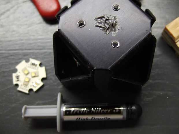 Satisfecho de que todo está funcionando, algunos compuesto térmico en el disipador de calor bajo del LED y luego el LED. Inserte y apriete los 3 tornillos, teniendo cuidado de que no corta a en cualquiera de los cables o almohadillas en la estrella. Una vez completamente asentado, utilice el multímetro para probar pantalones cortos.