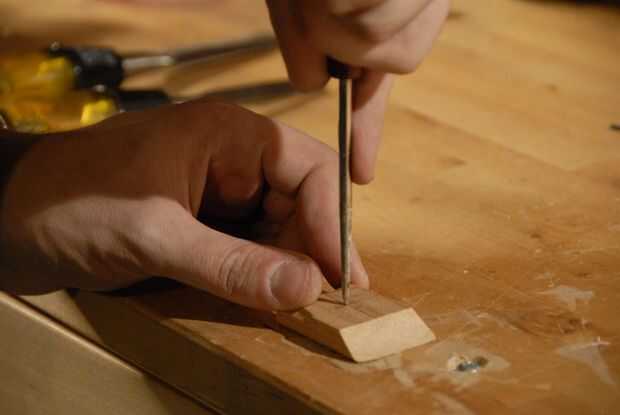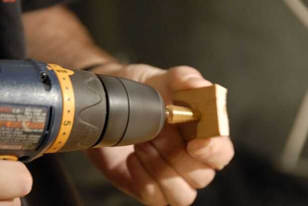 Ahora que desea encontrar el centro del plato y poner un agujero de 1/4" a través de él. Si estás usando un tornillo, que también desea biselar la parte inferior para que la cabeza del tornillo quede al ras.