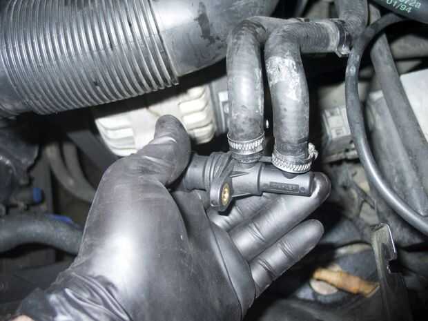 Después de inspeccionar visualmente la integridad de las dos mangueras y asegurarse de que no hay ningunas grietas, conectar ambas mangueras en el nuevo termostato conexión uno a uno con pinzas originales. No sobre apriete, accesorios son de plástico y frenará fácilmente.