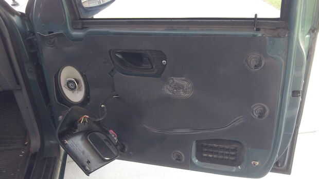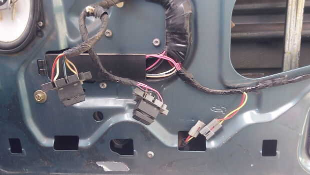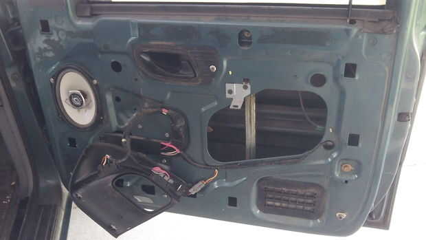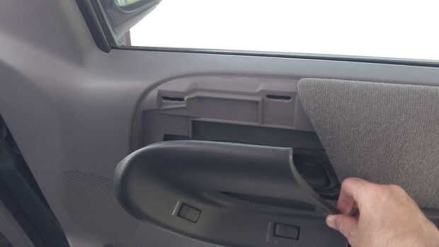El panel de la puerta principal se celebra con un par de tornillos y un montón de clips. Encontrar los tornillos y llevarlos a cabo. Tire suavemente en las partes del panel de puerta derecho hacia afuera para desenganchar a los. Si está trabajando en un carro como el mío, la manija de la puerta y los controles son en un subconjunto con los clips en la parte superior y las pestañas en la parte inferior. Tenga cuidado al tirar para que no romper las pestañas. Este panel también tiene unas conexiones eléctricas que deben ser desconectadas. Use un destornillador de cabeza plana para levantar el gancho luego tire suavemente aparte. Si el conector no soltarse, pueden ser capaces de pop el control fuera del panel. Esto era necesario para el eje de balancín de cerradura de puerta en mi carro.