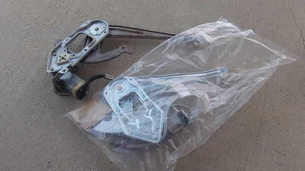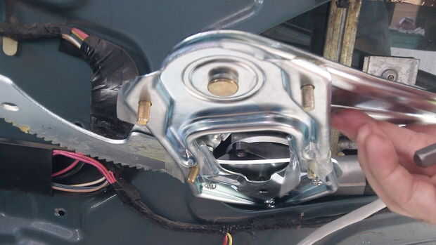 Una vez que todos los pernos en su lugar, maniobrar el regulador en la puerta. Asegúrese de que la diapositiva se involucra con la pista y alinee los pernos con los agujeros en la puerta. El brazo puede ser funcionado o la altura de la ventana ajustar todo a la línea de levantarse. La pastilla magnética puede ser útil cuando se trata de guía los pernos a través de la puerta. También es una buena idea poner una tuerca en cada tornillo como entra por la puerta. Es muy fácil tener una diapositiva a través al tratar de mover las cosas en su lugar.