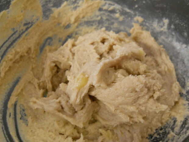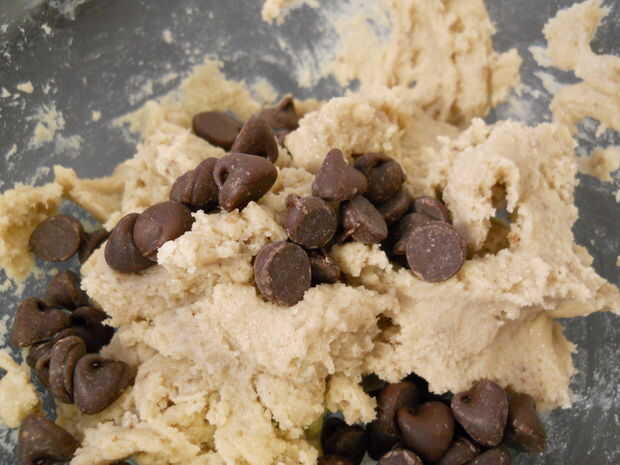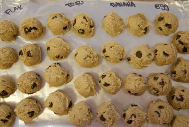 Siguiendo las instrucciones de la receta, combina la mantequilla, el azúcar morena y el azúcar y luego separó la mezcla en cuatro porciones. Agregué 1/4 de los sustitutos de huevo, uno en cada cuarto de la masa y luego añade el resto de los ingredientes como se indica. Usando una cuchara para galletas, había repartido la masa en una bandeja forrada de papel de aluminio y preparadas en el congelador durante la noche (esto ayuda a permitir el gluten en la masa para relajarse y asegura que las cookies no será resistentes al horno). A la mañana siguiente, yo al horno las galletas a 350 grados Fahrenheit durante 9 minutos.