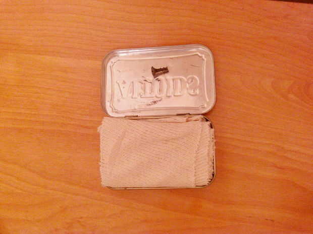 • Doblar la gasa con cuidado y firmemente por lo que puede colocarse en la cima de todos los otros elementos del kit susto en su lata Altoids.