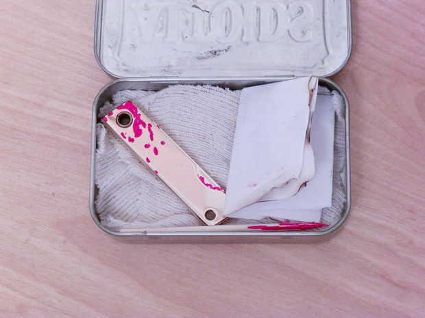 • Tomar el pincho de barbacoa y cortarla hasta una longitud para que quede en su lata Altoids.