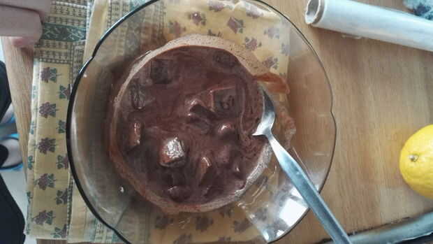 1. en un tazón pequeño de vidrio, verter la nata y el chocolate y colocar esta mezcla en una olla de agua caliente a baja temperatura (agua no debe tocar fondo del tazón de fuente), lo que se llama "Baño María". Revolver la mezcla frecuentemente hasta que casi derretido y reservamos.