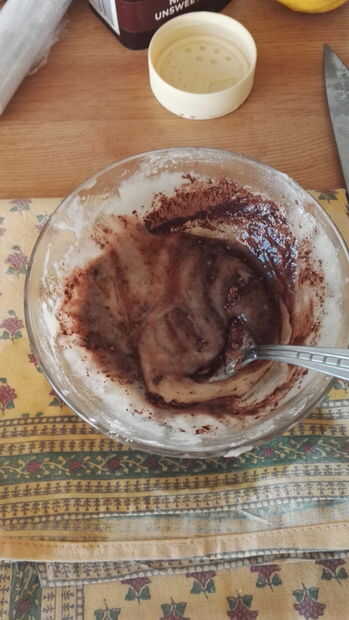 2. en un recipiente de vidrio se combinan el azúcar glas y la mantequilla hasta que todo está integrado. A continuación, añadir el cacao en polvo y seguir revolviendo hasta que la mezcla es homogénea.