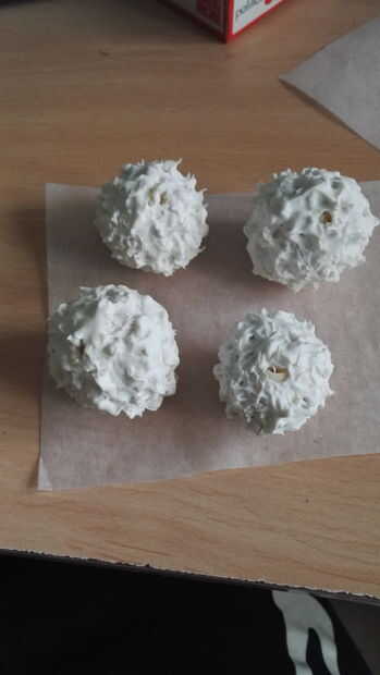 2. derrite caramelo blanco se funde (si agarro una trufa de chocolate blanco) o negro caramelo se derrita (si agarro uno chocolate oscuro) y con la ayuda de un pincel plano, empezar punteado el chocolate todo la trufa, que cubre las espinas"chocolate", pero mantiene su forma puntiaguda.