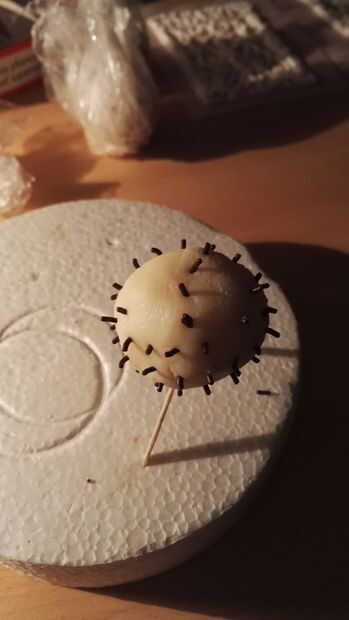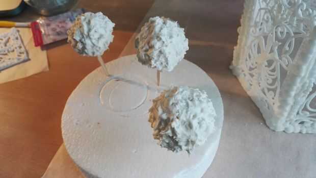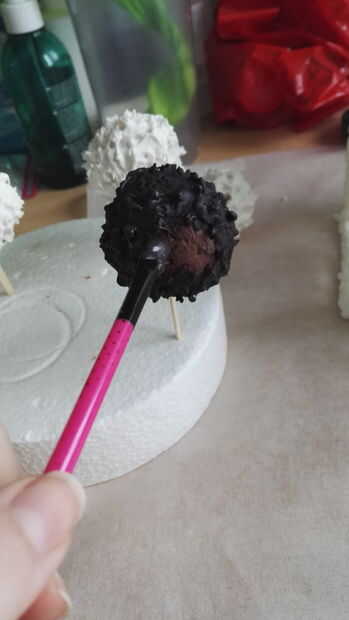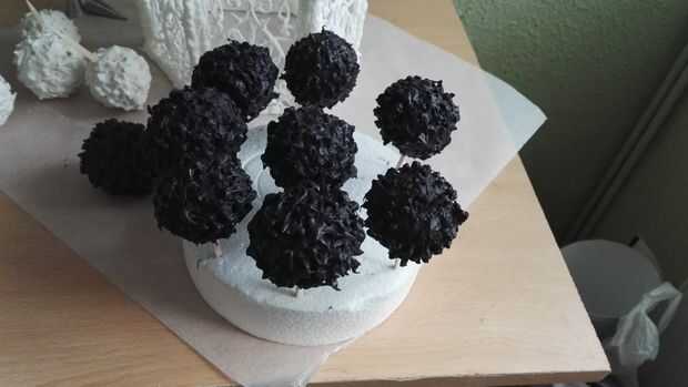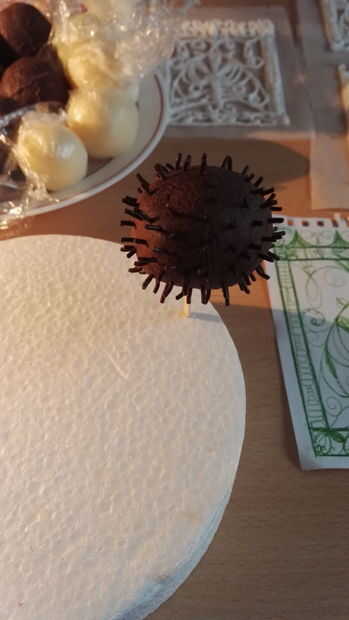 1. Inicio ase una trufa (después de algún tiempo ha pasado y son lo suficientemente difíciles) del congelador y, elegir el chocolate picado uno por uno, "puñalada" en cada uno de ellos, como si fueran espinas que salen del cuerpo de susuwatari. Inserte un palillo de dientes (como en una paleta de dulce) de la trufa y uñas en la base de espuma de poliestireno (ver fotos)